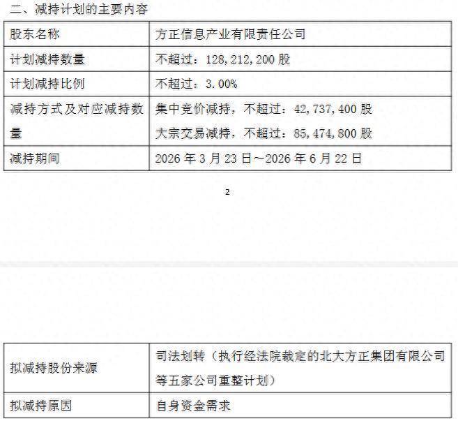 2月27日晚间,方正科技(600601)公告称,公司股东方正信息产业有限责任公司拟减持不超过12821.22万股公司股份十大证券公司,即不超过公司总股本的3.00%。其中,通过集中竞价交易方式减持不超过4273.74万股(不超过公司总股本的1.00%),通过大宗交易方式减持不超过8547.48万股(不超过公司总股本的2.00%)。